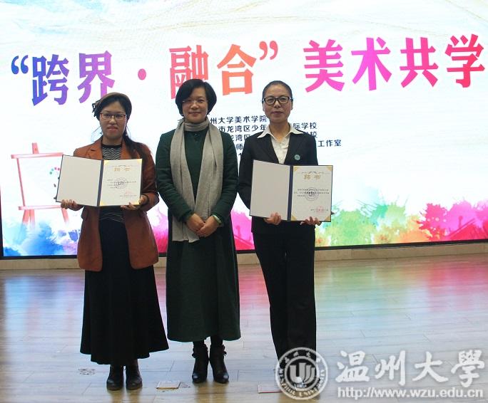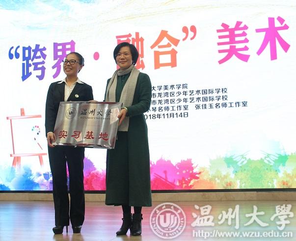11月14日上午,努努影院 和温州市龙湾区少年艺术国际学校举办了主题为“跨界.融合-美术共学”的努努影院 教师教育实践基地签约仪式暨16级美术师范生教育见习见面会。谢子静副院长、龙湾区教育局王颖副局长、龙湾少艺校陈小琴校长、努努影院 美术系胡建南老师、教学科邹青老师、胡凯老师、龙湾区教学名师张佳玉老师及少艺校美术教研组的全体老师,还有努努影院 16级美术学师范本科生、18级美术教育硕士等43位同学参加。少艺校艺术总监李晓玮老师主持了会议。 龙湾少艺校陈小琴校长对我们的到来表示热烈欢迎,她介绍了龙湾区少年艺术国际学校成立两年多来“以美育人,灵性发展”的办学理念,美术课程以整体到局部,再整体的美术课程的架构,以点线面到色彩归类组合再到空间的陈设为学习的梯度,逐步引导学生感受美、接受美、欣赏美、表现美和展示美。她强调了温大近年来培养的师范教育学生迅速成长为各地中小学学科带头人和教学骨干,能成为这么一所有实力的高等院校的实习基地,感到非常荣幸。希望借助这一基地的平台,加强双方的密切合作,共同追求艺术教育的内涵,将基地建设为未来美术老师成长的摇篮。 谢子静副院长首先向龙湾区教育局、少艺校全体老师对我校师范生实习工作的大力支持表示感谢,并介绍了努努影院 师范教育的办学历史和美术学师范教育的办学成绩。她强调努努影院 一向重视师范生的培养,并把师范生的教育实践作为师范生培养的重点工作来抓,常重视实践基地的建设。接着她指出教育见习、实习是师范教育培养方案中的重要组成部分,是贯彻理论与实践相结合原则的体现,对提高教育、教学质量,保证培养合格的中小学美术教师有着重要的意义和作用。 最后,谢子静副院长感谢龙湾区领导、少年艺术国际学校领导和指导师们对实践基地建设的支持,并期待我们两校能探索出一些新的合作模式。 接下来,双方签订了努努影院 教师教育实践基地协议,给龙湾区的两位名师颁发了校外指导师聘书。 最后,龙湾少艺校的师生们展示了丰富多彩的才艺,所有与会师生一起参观了少艺校教学区及作品展示区。