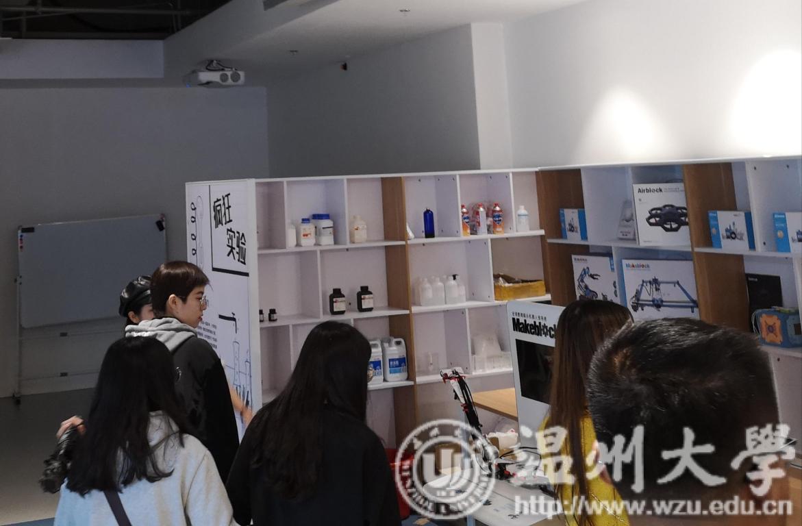 讲解员带同学们来到产品展示区,带同学们观看了近几年各工作室所发明的产品,介绍了无人机的开发与人工智能发展为人们生活带来的巨大改变。