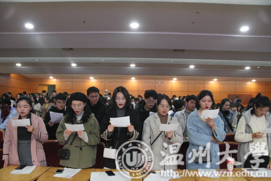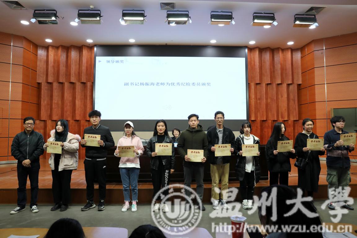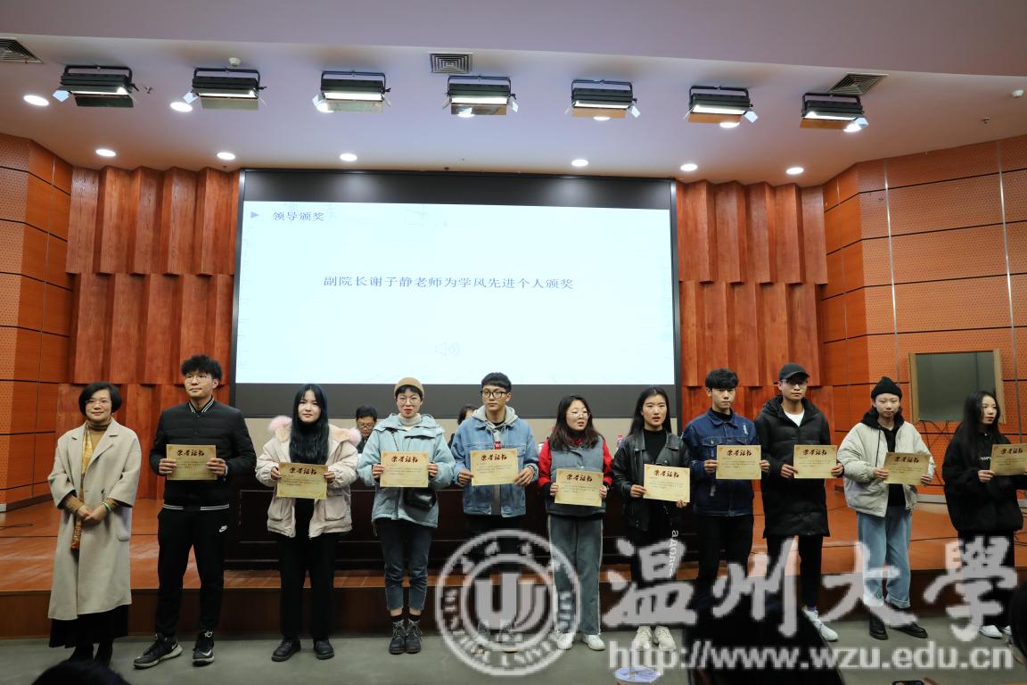 大会之初由学生科李雪涛老师汇报本学期学风考勤情况。李老师以年度数据、迟到数据、旷课数据、晚自习数据全面总结了本学期美院考风考勤情况。紧接会议进行第二项议程学风表彰。由学风纪检部部长宣读本学期优秀纪检委员、学风先进个人以及班级名单。接着,学生会主席陈晨宣读本学期招生宣传优秀宣传大使、艺术团优秀团员表彰决定。院领导为获奖同学颁奖以示鼓励。随后由全体学生宣读《诚信考试承诺书》并签字承诺。