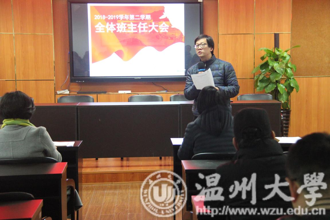 新学期,新风貌。为进一步加强班级建设,增强班主任工作的主动性,促进学院德育工作全面开展,2月27日下午,努努影院 在2B4001会议室召开了新学期班主任工作会议。 会上,学生科叶筱卉老师对开学初班主任基础工作做了安排部署。开学初,班主任老师要召开本学期第一次主题班会,深入了解并掌握学生思想、学习、生活等方面的情况,加强班集体建设,营造新学期浓郁的学习氛围,善于利用学工系统并做好数据维护;毕业班班主任老师须重点做好未返校毕业生的安全教育工作,毕业班班主任还要认真做好毕业生就业指导与服务工作,尽早达成就业意向。叶老师还通报了学生返校情况,并就上学期“优秀学生干部”和“工作积极分子”评选结果向班主任老师征求意见。 学院党总支副书记杨振海强调,班主任老师身兼多职工作在育人的第一线,为学院德育工作做出了很大贡献。本学期班主任老师们要重点做好三方面工作:一是在大数据时代要利用好学工系统的各种数据库开展育人工作;二要重点关注和帮扶心理健康和学业困难学生;三是交通安全、财产安全和防诈骗等安全教育要常抓不懈。