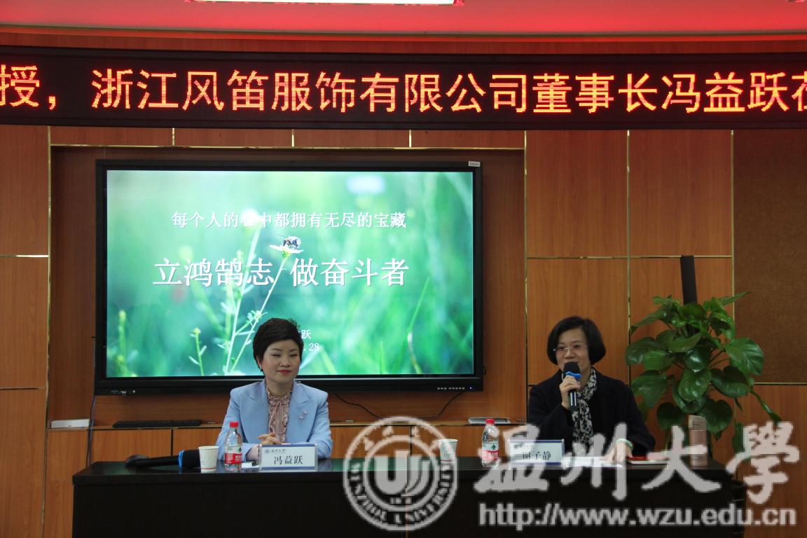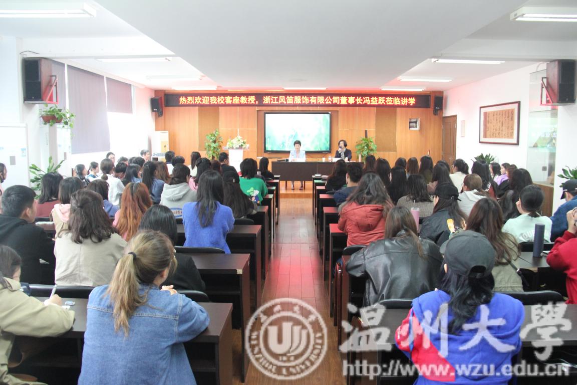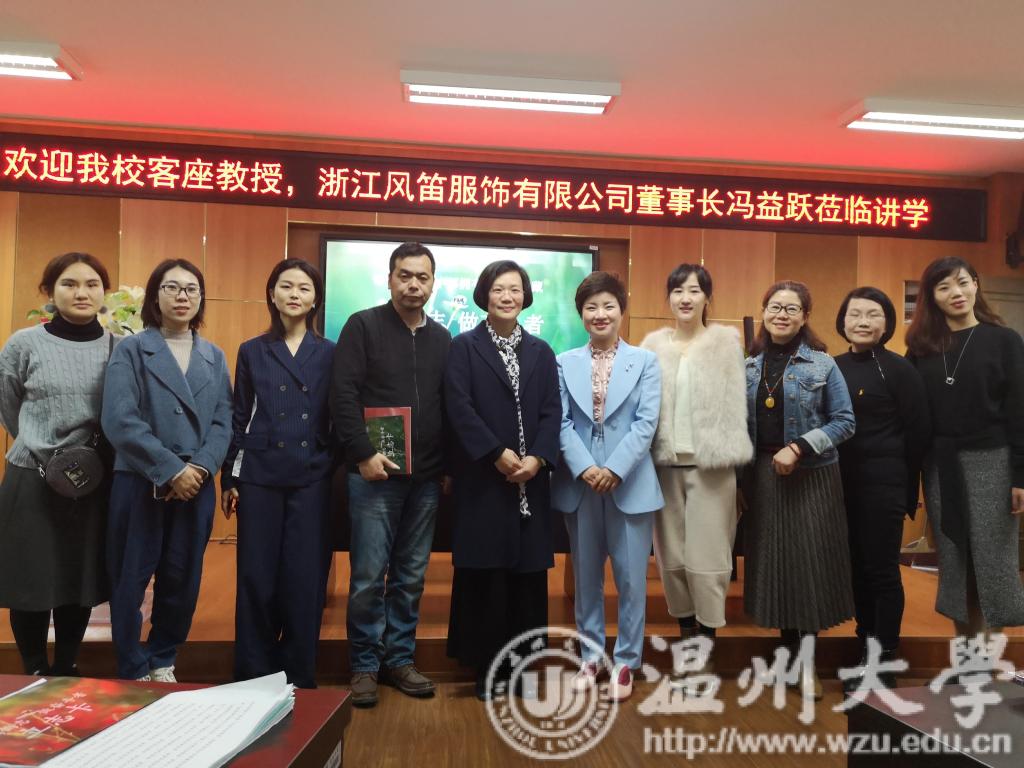 3月28日下午,我校客座教授、浙江风笛服饰有限公司董事长冯益跃女士莅临努努影院 讲学,主题为《立鸿鹄志,做奋斗者》,学院院长李运河教授、副院长谢子静教授、学生科科长叶筱卉、服装与服饰设计教研室主任钟信群以及相关专业教师和学生参与观听,全场座无虚席。学院副院长谢子静教授主持。 讲座主要围绕心、道、德、事四个层次,分别讲述冯董自己个人的创业史以及有关励志教育,案例生动形象,内容深入浅出,她以平实亲和的语言教导在座的莘莘学子,要立鸿鹄志,勇做奋斗者。充分展现了一个无私无我、奉献社会的新时代成功企业家形象。 在为时两个半小时的讲座结束后,同学们热情不减,积极互动提问,作为我校客座教授的她均一一热情予以解答。会后,与会成员合影留念。