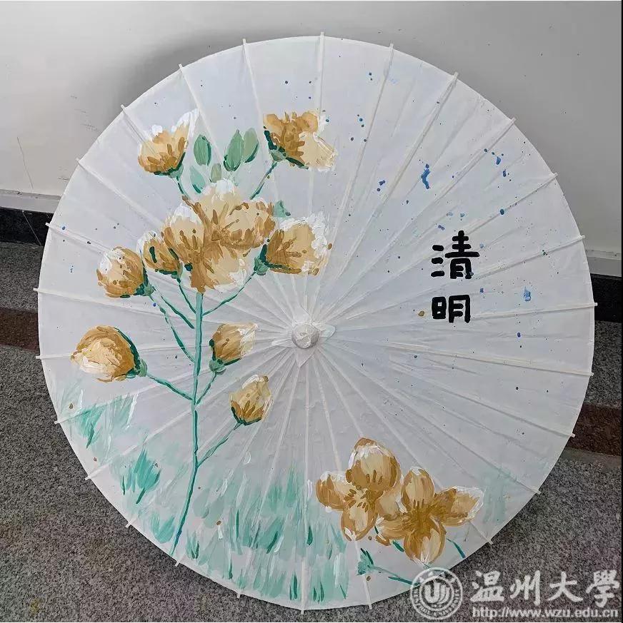 经过一番紧张又有趣的清明节知识竞猜后,同学们挑拣了自己要用的颜料和工具,寻一处空间,便三五成群的开始在伞上勾勒自己的图案,有的参赛组在细心地描绘起自己的草图,而有的参赛组却是在泼墨挥毫,肆意豪迈。各处情形不一而足,色彩渐渐渲染了这一方天地。随着画笔的腾挪转换,纸伞上的各个参赛组的画作渐渐明晰,或细腻婉转,或写意风流,或简约可爱,风格万象,让人有些应接不暇。