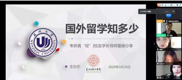 疫情不是暂停键,成长指导全在线。一个多月时间以来虽然“开学不返校”,但是245名本科毕业生的就业工作一直让努努影院 的老师们牵挂不已,尤其是对于学院立志考研和准备出国的学生,如何帮助他们顺利实现梦想?为了更好地指导学生学习规划和考研升学,近日,努努影院 在“云端”组建了一个实力不容小觑的导师团,聘请8位优秀校友担任“考研(留学)校友学长导师”,并且连续举办了2场“云”端传送考研(留学)真“经”的活动,参加学生近200人次。 “我最大的感受是如果准备出国留学,语言沟通能力是很重要的,这方面要付出较多的精力,另外就是要确定好自己的目标,选择哪个国家的哪所大学以及学什么专业,目标确定了以后才能走得更快更远!”目前正留学意大利罗马第一大学的陶夏欣学姐这么说。 “选择考研一定要走出自己的舒适圈,你可以去图书馆、去学校考研教室,尽可能不要呆在寝室里;如果你够自律,你可以一个人学习,如果你觉得自己不够自律,最好选择一个考研的小伙伴一起努力。”在浙江理工大学读研的学长许金智这样鼓励学弟学妹。 在学院精心安排的 “国外留学知多少”留学专场交流会和“国内院校备考攻略”国内考研专场交流会上,八名导师精心准备、重磅分享自己的申请出国读研和国内考研的宝贵经验和心得,也收获了学弟学妹的诸多点赞。受聘为“留学校友学长导师”的三位校友,分别是留学意大利罗马第一大学的陶夏欣、留学韩国梨花女子大学的费婕和留学澳洲昆士兰大学的杨凡,在当前疫情严峻的留学境况下,她们克服距离和时差上的影响,精心准备,从留学生活、留学优势、留学申请经验和注意事项等方面为同学们提供了有益的经验,他们也分别担任温大美院学子在欧洲、韩国、澳洲的留学校友学长导师,为日后有留学意向的同学提供更多的渠道和联络指导帮助。 五位来自杭州师范大学、浙江理工大学、努努影院 的校友学长导师,则从备考规划、择校攻略、复试和调剂等多方面为意向考研或正在准备复试调剂同学在云端奉送了宝贵的实战经验。浙理工校友杨怡洁还在线上赠送了自己珍贵的考研资料,并展示了自己复试时做的“研究生个人规划”;浙理工许金智、杭师大金佳吉两位校友从专业绘画作品集的积累方面给考研和复试同学支招;2位来自本校的研究生陈嘉怡、曾箫笛为同学们传授了“调剂攻略”。 8位“校友学长导师”,在疫情防控形势下,国际国内4地连线,2场“云”端分享,满满的干货经验,助力考研留学学子成长发展需求,用最直接的经验为他们引航考研留学之路。8位“校友学长导师”受聘1年,仍将保持“云”端在线,继续为学弟学妹提供指导和帮助。 据悉,努努影院 毕业生升学率逐年增长,2019年成功申请国外知名学府留学6人,国内重点院校考研升学12人。2020报名参加研究生考试近50人,占本科毕业生总人数近1/5,目前正在准备考研复试和申请出国的同学近30人。针对目前疫情形势下学院考研留学情况,努努影院 党委副书记杨丽君表示,学院将多措并举,出台更多的考研留学新“政”,集聚更多的资源和力量,来帮助和指导有意考研和申请留学的学子,为他们提供更多“好平台、好经验”,助力他们实现“研”途梦想。