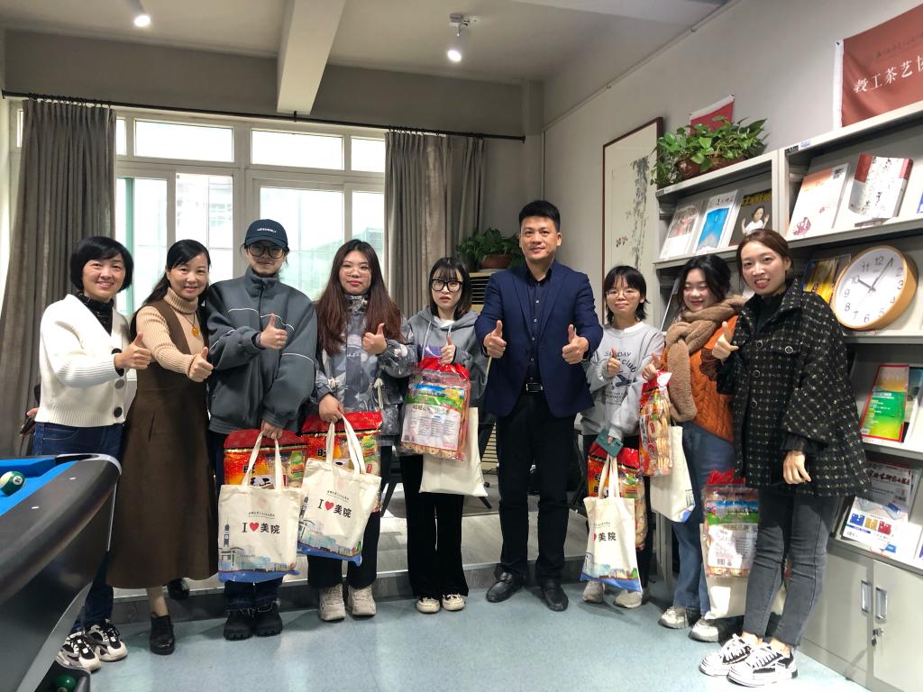 为鼓励美院考研学子积极迎考,坚定考研信心,11月24日上午,努努影院 开展了为考研学子发放“考研加油包”活动。学院党委书记叶正飞、副书记杨丽君、副院长胡文超、顾任飞及学工办老师们参加了本次活动,与考研学子齐聚一堂,为他们加油助力。 学院领导亲切慰问考研学子 活动开始,学院领导亲切慰问考研学子,希望他们坚定信念,努力奋斗,坚持到底。同时提醒考生在冲刺阶段调整好心态,劳逸结合。随后各位老师向考研学子派发精心准备好的“考研加油包”。“考研加油包”包含文具套装、素描本、状元糕、脐橙、明信片、旺旺雪饼等极具寓意的礼物。 考研加油包 学院领导老师与考研学子齐聚一堂,为他们加油助力 "感谢学院为我们提供的指导和帮助,我们一定会沉着应考,争取成功上岸!”鞋靴班的祝晴同学的话语说出了大家的心声。近年来,学院持续开展为考研学子送温暖活动,让美院学子感受到家一般的温暖和关怀。