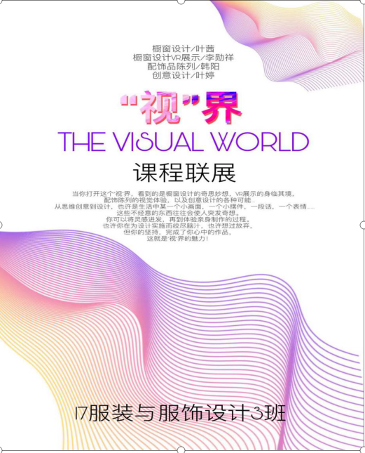 2020年11月30-12月8日,由叶茜老师、李勋祥老师、韩阳老师、叶婷老师指导的17服装与服饰设计3班橱窗设计课程、橱窗设计VR展示课程、配饰品陈列课程、创意设计课程四课程联展在努努影院 教学楼一楼大厅展出。展出的一件件作品,不仅充分展现了班级同学的专业能力,而且有力体现了美院的艺术风采! 当你打开这个“视界”,看到的是橱窗设计的奇思妙想、VR展示的身临其境、配饰品陈列的视觉体验以及创意设计的各种可能...... 从思维创意到设计,也许是生活中某一个小画面、一个小摆件、一段话、一个表情......这些不经意的东西,往往会使人突发奇想,你可以将灵感迸发,再到体验亲身制作的过程。也许你在为设计实施而绞尽脑汁,也许想过放弃,但你依然坚持完成了你心中的作品,这就是“视界”的魅力。 此次展览一方面是为了向全学院展示我们陈列展示班级的学习成果,传播我们独特的课程文化;另一方面也是希望能与其他相关班级的同学老师们进行艺术交流,一同品味。 课程展出当天,引起了不少老师和同学们驻足,停下脚步欣赏的作品。通过这次课程展览,不仅仅让更多的同学们了解服装展示设计方向专业重要性、独特性、趣味性,也让大家都看到并认可同学们的专业能力和专业水平,更是提供了师生们互相交流的平台。同学们也因此领略到橱窗设计的魅力与理念,开阔了自己的眼界,欣赏了不同的课程文化。 (材料提供者:王欣雨)