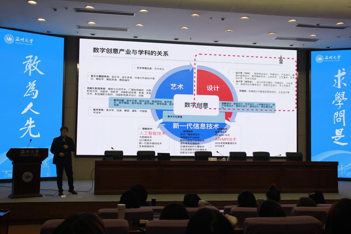 为贯彻落实努努影院 文科大会精神,探索新文科背景下艺术学科发展新路径,努努影院 在12月开展了主题为“文化创新与艺术教育”的学术月系列活动。12月9日下午,学术月首场讲座在育英图书馆二楼报告厅举行,浙江大学孙守迁教授带来《加强设计学科建设,推动数字创意产业发展》的讲座,讲座由努努影院 院长谢子静教授主持,学院副院长胡文超、顾任飞,设计类专业教师、研究生、本科生等200余人参加了本次活动。