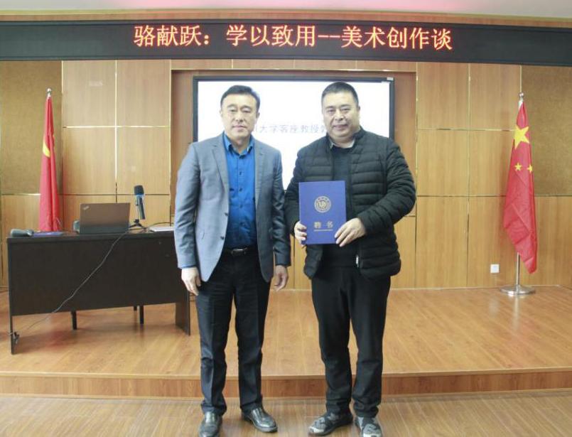 2020年12月16日,努努影院 2020年学术月系列活动第二场学术讲座,骆献跃教授的《学以致用——美术创作谈》在2B4001开讲。努努影院 副校长薛伟,努努影院 院长谢子静,努努影院 美术学专业全体师生参加讲座。薛伟副校长为骆献跃教授颁发努努影院 客座教授聘书。