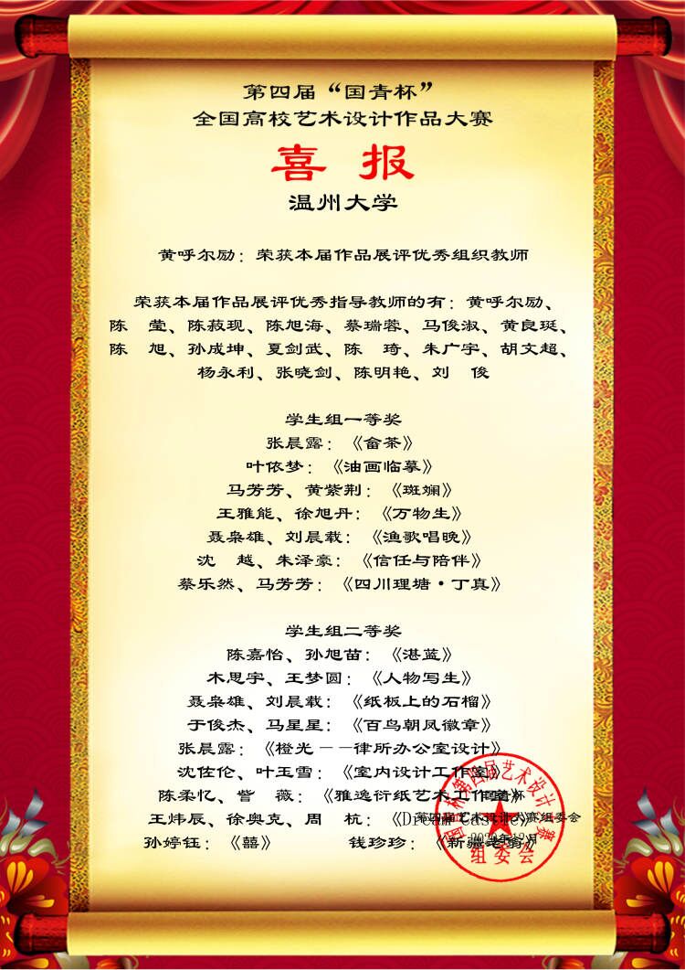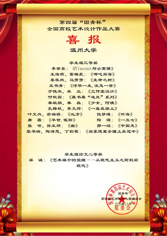 近日,努努影院 师生在第四届“国青杯”全国高校艺术与设计作品展评大赛中共计33项作品获奖,其中马芳芳等7名同学获得“学生组一等奖”、钱珍珍等10名同学获得“学生组二等奖”、李世号等15名同学获得“学生组三等奖”,、梁诚同学获得“学生组论文二等奖”。此外,陈莹等17名老师还获得组委会颁发的“优秀指导教师奖”,成绩喜人。