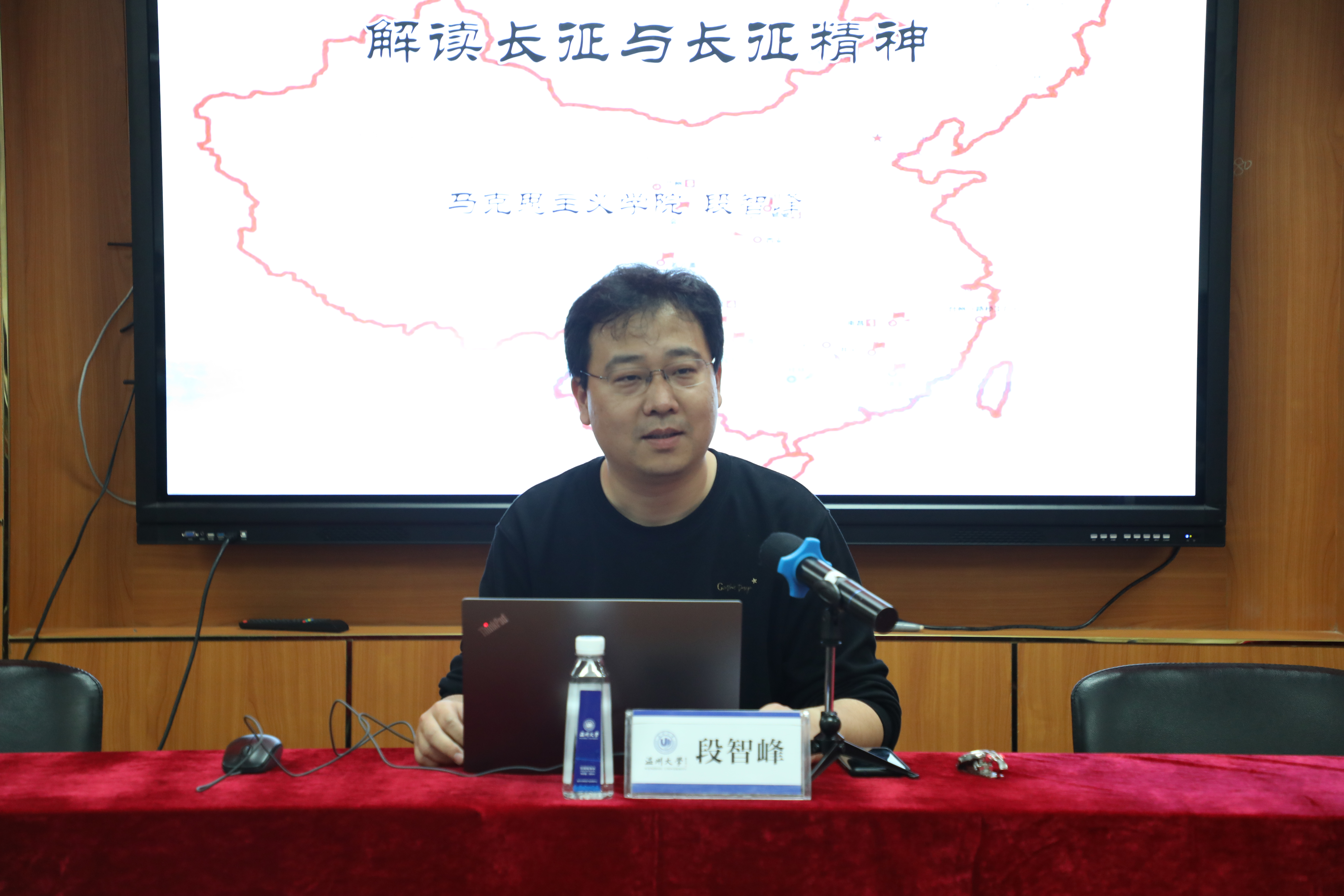动员部署会后,马克思主义学院博士、温大党史学习教育讲师团成员段智峰以《长征与长征精神》为题作专题讲座,段智峰博士从长征的概念、长征的原因、长征的历程、长征的意义与启示四个部分,用叙事的方式将丰富翔实的历史材料娓娓道来。段智峰最后强调开展党史学习教育意义重大,希望大家通过学习党史传承优秀传统,走好新时代的长征路。