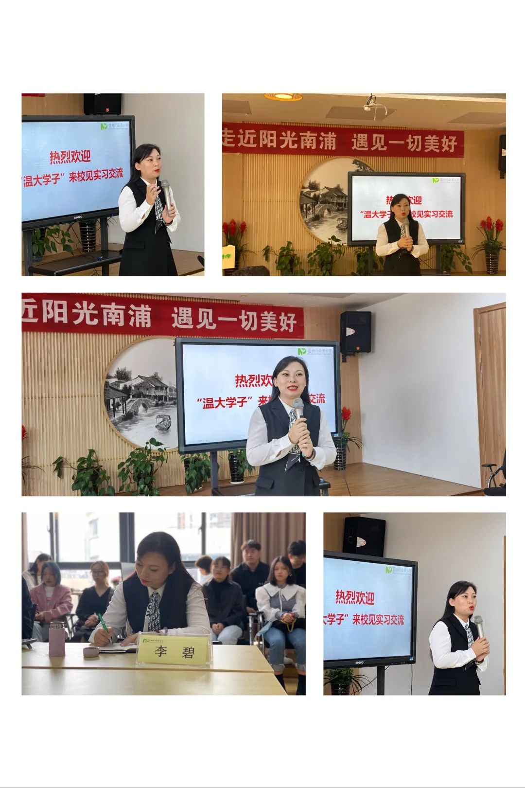 见面会上,我校见习生代表做了发言,她首先表示对温州市南浦小学周到细致的实习安排表示感谢,同时表达了严格遵守学校日常管理条例,珍惜机会,虚心请教,踏实学习,以教师身份严格要求自己,深入见习班级,了解学生动态,高质量地完成见习任务的决心,为多彩青春抹上最亮丽的一笔。接着,温州市南浦小学教导主任李玲玲老师从作息时间、听课安排、学生安全教育、见习要求等事项向见习生们做了具体介绍。