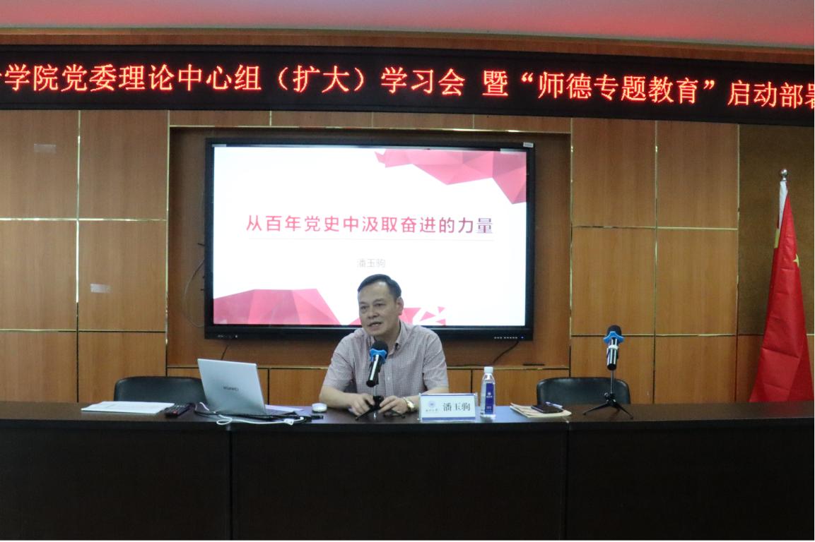 6月16日下午,校党委委员、宣传部部长潘玉驹教授以《从百年党史中汲取奋进的力量》为题为努努影院 师生党员上专题党课。潘委员从中华民族的历史史册开篇,带我们重温半条棉被、抗日英雄杨靖宇等党史故事,回顾中国共产党传奇的建党历程,指出我们党的光辉百年,是矢志践行初心使命的一百年、是筚路蓝缕奠基立业的一百年、是创造辉煌开辟未来的一百年。潘委员强调,中国特色社会主义进入新时代,中华民族伟大复兴曙光在前、前途光明,但也面临着严峻挑战,在这个关键当口,全体师生要以史为镜、以史明志,增强历史自觉,激发为实现中华民族伟大复兴而奋斗的信心和动力,做到“六个进步”,以昂扬姿态奋力开启全面建设社会主义现代化国家新征程,以优异成绩迎接建党一百周年!