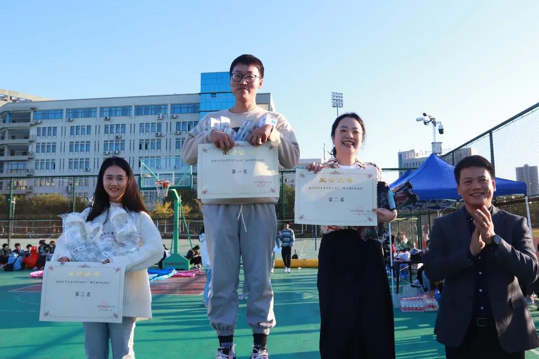 一个人可以走很快一群人可以走很远年轻、热血、伙伴、团队步履不停,不负好时光11月10日下午,美院2021-2022学年秋季趣味运动会在南校篮球场举行,由各班组成的26支队伍及2支教师职工队伍参加了比赛。在活动开始前,团学指导老师石建林老师为大家致了简短的开幕词,让同学们了解比赛规则并且明白举办此次活动的目的与意义。随后比赛正式开始。此次趣味运动会的比赛项目有“毛毛虫竞速”、“旋风跑”、“全场往返运球投篮”等六个项目。01毛毛虫竞赛:由于道具较重又比较胖限制了比赛队员的行进速度和动作,比赛是看起来像一只只胖胖的毛毛虫在摆动,很是可爱。02两人三足:培养了同学之间的合作意识,加强了合作默契。03车轮滚滚:同学们和老师配合的相当默契,最终顺利抵达终点。04旋风跑:同学们拿着长杆绕着柱子跑,惊险刺激的绕柱赛跑很有乐趣。05全场往返运球投篮:每个同学都很卖力,奋力的将手中的篮球命中篮筐。比赛成绩01毛毛虫第一名 教工二组第二名 教工一组第三名 20服设2班02两人三足第一名 20服工第二名 21设计7第三名 20环艺203车轮滚滚第一名 21服工第二名 教工组第三名 20环艺2、20服设1、20美师204篮球接力第一名 20环艺2、20服设1、20美师1、20美师3第二名 教工组第三名 20美师2、20美师3、20服设205集体跳绳第一名 21服工第二名 21设计1第三名 20视传06旋风跑第一名 21服工第二名 20环艺2趣味运动会欢乐的游戏使得大家乐在其中,丰富了同学们的课余生活,缓解了学习的压力,培养了同学之间的团结配合能力,增进了彼此之间的友谊,充分展示了大学生的良好精神面貌和体育风采培养了团结奋斗的团队精神展示了健康向上的青年形象。