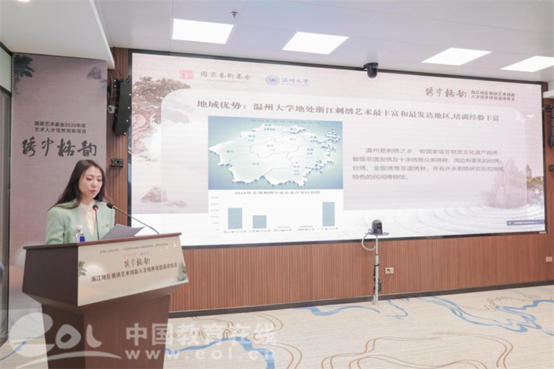 温州市文化广电旅游局局长朱云华回顾了瓯绣辉煌。她表示,温州市鹿城区秉持以复兴“百工之乡”为己任,多年来,温州市委、市政府对刺绣艺术和产业的发展高度重视,积极搭建各绣种的传承发展、展览展示平台,大力扶持刺绣艺术文化发展,长期推动非物质文化项目进校园等,筑牢传统根基,延伸产业链条,为经济社会全面发展注入深厚的文化底蕴和强大的精神支撑。她希望通过本次国家艺术基金《浙江地区刺绣创新艺术人才培养项目》启动,大力推进温州非遗人才培养,促进温州工艺美术薪火相传、代代守护。