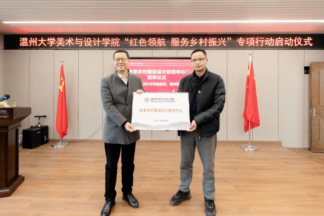 12月24日下午,努努影院 举行“红色领航 服务乡村振兴”专项行动启动仪式,并与文成周山、瓯海丽岙、洞头霓屿等首批八个单位握手党建、共建“美育基地”,正式吹响“红色领航 服务乡村振兴”的号角。自党的十九大提出乡村振兴战略以来,努努影院 师生积极探索发挥高校的智慧和力量、服务温州乡村振兴。近年来,温大努努影院 依托美术学和设计学专业优势,也做了不少探索和实践。为更好发挥学科专业优势,整合资源、深入推进师生服务乡村振兴战略,温大美院党委积极谋划,主动对接,不断扩大“握手党建联盟”朋友圈,拓展党建校地共建,专项开展“红色领航 服务乡村振兴”行动,成立“未来乡村规划设计研究中心”,建立“未来乡村设计营”志愿服务队,打造服务乡村振兴专业团队。启动仪式上,努努影院 党委委员、组织部长郑信军为“未来乡村规划设计研究中心”授牌,努努影院 团委副书记易招娣为“未来乡村设计营”志愿者服务队授旗。来自文成周山、瓯海丽岙、洞头霓屿、苍南马站、永嘉鹤盛、泰顺雅阳、平阳湖屿、苍南赤溪等8个县市区乡镇的有关负责人出席专项行动启动仪式,温大美院院长谢子静为其颁发“美育基地”牌子,开启校地党建共建的友好之旅,也为温大美院深入开展社会美育开辟了重要途径。此次“红色领航 服务乡村振兴”行动,得到社会各界的大力支持,美院优秀校友、浙江映筑环境规划设计有限公司总经理颜士洲先生无偿捐赠20万元,成立“努努影院 乡村振兴教育基金”,用于专项资助和奖励学院乡村振兴实践项目及服务乡村振兴领域做出贡献的优秀教师与学生。据温大美院党委书记叶正飞介绍,近年来,温大美院为深入贯彻落实习近平总书记重要讲话精神,在以艺术创作文化创新上服务地方文化艺术繁荣,以环境设计文创推广上服务乡村振兴,以创新创计赋能产业转型升级上服务经济发展三个方面积极作为、取得卓越成绩,希望以此次“红色领航 服务乡村振兴”专项行动为新的契机,广大师生增强服务乡村振兴工作的责任感和使命感,努力在服务乡村振兴中实现人才培养、学院发展共赢,广大青年大学生努力在服务乡村振兴中锻炼专业,淬炼品质,让青春之花在祖国最需要的地方绽放。