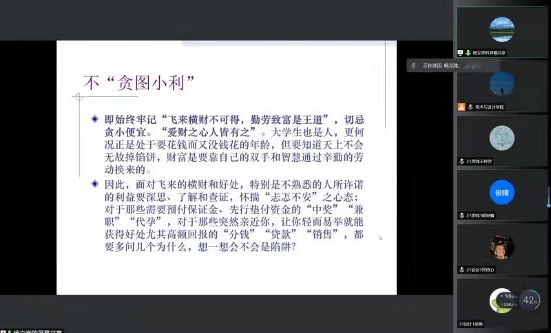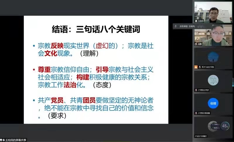 2021年12月22日晚18点,努努影院 2021级形势与政策报告会在疫情防控的要求下于线上举行。本次会议的由努努影院 学工办主任杨鹏老师主持,并特邀了马克思主义学院党委书记王柏民老师、努努影院 纪委副书记杨立淮老师以及努努影院 学生共计两百余人。本次会议旨在通过线上讲座的形式,为广大学生解读马克思主义宗教观以及构建网络安全生态环境下对大数据时代的思考,进行反诈防诈教育,建设和谐安全的校园。