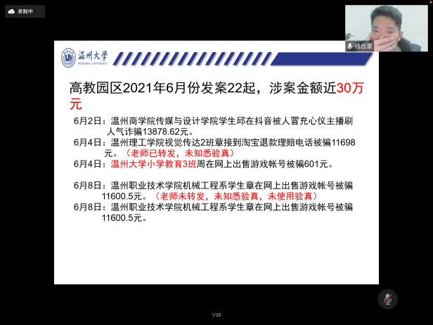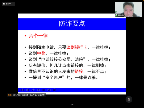 首先,钱合激老师指出大学生常见的安全问题主要分为财产安全、人身安全、意识形态安全、反诈防诈、寝室消防安全、宗教知识教育等,共同建设和谐美好的平安校园需要全体同学的努力。钱老师结合最近努努影院 城内相关诈骗案件的最新情况,警示我们诈骗离我们并不遥远,除了电话诈骗和网络兼职诈骗,还要防范钓鱼网站的诱惑,提高警惕,防诈反诈。同时,他也向同学们介绍了网络诈骗的特点,常见的电信诈骗手段,讲解防诈骗常识,引导学生树立正确的消费观以及在生活中如何防止被套路贷等知识。钱老师通过经典案例、相关反诈宣传视频、图片,列举了电信网络诈骗犯罪的几种常见形式,有针对性地向同学们阐述了如何识别防范电信网络诈骗及上当后的补救措施,并号召同学们:电信网络与我们息息相关,我们要强化系统观念与法治思维,提升防范和辨别诈骗的能力和水平,推动建设更高水平的平安校园。