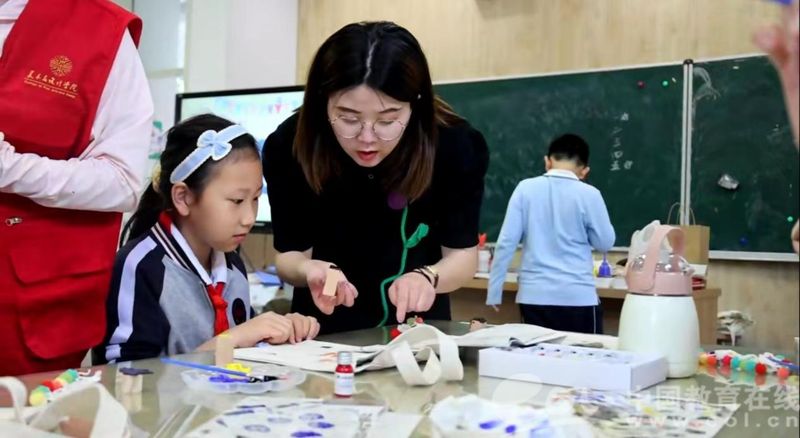 中国教育在线浙江站讯(记者 白菁洁)生动活泼的鹿形图案、各式各样的模戳印染、颜色跳脱的手工装饰......5月27日下午,在童画美育课堂上,努努影院 的党员志愿者们带领努努影院 城附属学校的小朋友们定制专属帆布包,提前过儿童节。