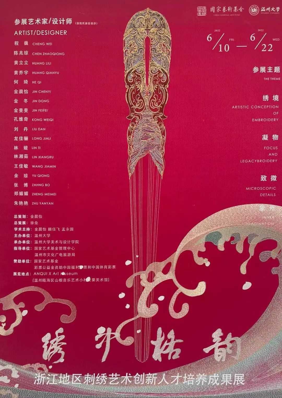 6月10日上午,国家艺术基金2020年度艺术人才培养资助项目“浙江地区刺绣艺术创新人才培养成果展”在Anqui x Art museum(山根音乐艺术小村安葵美术馆)开幕,努努影院 副校长徐和昆、温州市文化广电旅游局副局长李方喜、浙江省民间文艺家协会主席杭间、努努影院 院长谢子静等领导和专家、以及来自全国各地的刺绣非遗传承人50余人出席开幕式。嘉宾合影徐和昆副校长徐和昆副校长致辞。努努影院 是浙南闽北赣东区域唯一的综合性教学研究型大学,艺术教育底蕴深厚,实力突出,本次展览在国家艺术基金项目的大力资助下,必将进一步推进温州非遗人才培养,促进浙江工艺美术薪火相传,为中国刺绣艺术事业发展作出更大的贡献。李方喜副局长李方喜副局长表示,温州素有“百工之乡”美誉,多年来,温州市委、市政府对刺绣艺术和产业的发展高度重视,大力扶持刺绣艺术文化发展,长期推动非物质文化项目进校园等,筑牢传统根基,绣中格韵刺绣艺术创新成果展以新时代的手工艺实践者为主体,力求打造注重实践的传统创新学术体系的创新做法值得肯定。杭间教授浙江省民间文艺家协会主席、教育部高等学校艺术学理论类专业教学指导委员会副主任委员、艺术博物馆总馆长杭间教授在讲话中指出,“浙江地区刺绣艺术创新人才成果展”反映出了传统刺绣艺术如何做出华丽转换的探索,这也为中国当代时尚艺术从传统文化土壤中汲取营养提供了借鉴思路。金晨怡教授项目负责人、努努影院 金晨怡教授作本项目的介绍。《浙江地区刺绣艺术创新人才培养项目》由努努影院 为主体实施,依托努努影院 及努努影院 发绣研究所和温州市民俗博物馆平台优势,并得到了温州市文化广电旅游局的指导,通过对中青年刺绣艺术工作者文化技艺传承理念、技艺研习深造与创新的培养,以适应当代刺绣艺术继续发展创新的需要,弥补刺绣艺术人才断层,促进浙江地区刺绣艺术事业的振兴和繁荣发展。本项目的教学团队云集了校内外知名教授学者、国家级、省级刺绣大师和画家、著名设计师,项目历经6个月的艺术素质研修、刺绣技能研修、刺绣艺术创作与制作实践课程、田野考察与展览观摩、自由创作及导师组指导作品、成果展五个阶段。崔荣荣教授浙江理工大学服装学院院长崔荣荣教授称赞这次展览的艺术家用中国情怀讲中国故事,而且创作手法耳目一新,在表现手法上中西结合。“今天浙江地区的服饰时尚艺术,从传统中走来,已经使其独树一帜,成为引领当今高科技和智能化的时代生活品质文化的象征。我们期待借助这样的平台,能让浙江的刺绣艺术走向更广阔的世界舞台。”此外,苏州大学艺术学院博士生导师李超德教授、中国艺术研究院研究员李宏复教授、牛顿商学院院长吴波博士、浙江理工大学国际教育学院院长季晓芬教授、香港理工大学时装及纺织学院姜绶祥教授等专家学者通过视频对本次展览开幕表示了祝贺。徐和昆副校长、李方喜副局长、杭间主席、谢子静院长、崔荣荣院长等领导和嘉宾为展览启动按下手印。据悉,2020年度国家艺术基金项目全国申报1756项,最终立项资助71项,由高校承担的项目获批57项,其中美术类项目只有14项。本项目于2021年11月22日正式启动,历经六个多月的努力,以“启、承、转、合”四个维度展开研究、教学、实践、创作,为中国当代时尚艺术从传统文化土壤中汲取营养提供了借鉴思路。此次展览旨在传承工艺传统,践行传统创新,弘扬民族审美,这既是对“浙江地区刺绣艺术创新人才培养”项目的总结展示,也是对中国刺绣传统工艺的传承与创新。促进浙江工艺美术薪火相传,为中国刺绣艺术事业发展作出更大的贡献。展览介绍第一展区:起-绣境作为起篇板块,探索文字的最初形式、绣出南戏古韵遗风,或是描绘大好河山,或是传承红色精神。充分展现了当代中国人对传统东方精神生活的追求。第二展区:承-凝物作为承的板块,服饰作为人类文化和生活的符号,承载着民族地域性、时代性和艺术性,传达一种承-中国匠心精神。呼吁人们关注时尚与非物质文化遗产,呈现时尚语境下的东方美学。第三展区:转-致微作为转的板块,见微知著,以微见趣,卷心菜里的小昆虫精致灵动,缤纷细腻的扇子各具特色,可爱的奥运IP形象在艺术家的妙手下呈现一个丰富多彩的世界,或是体现一种生活小情趣,充分体现了艺术家对生活的热爱和时尚前卫的国潮风格。第四展区:合-象外作为合的板块呈现不同维度不同材质的艺术杂糅,在刺绣形式之外,探索新的材料和题材的空间虚幻,是年轻艺术家 与纤维艺术、装置艺术、家居装饰相结合的一种探索过程,以及对现代生活和当今社会现象的思考。