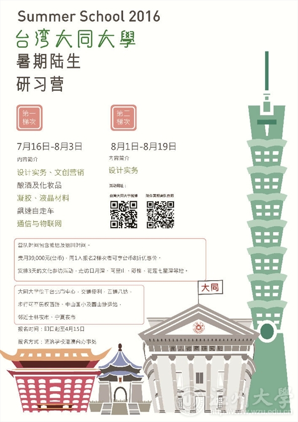 2016年暑期赴台湾大同大学设计营报名通知 一、活动宗旨: 近年来,两岸四地高校间学术活动交流频繁,大同大学为促进两岸师生进行交流与彼此认识,鼓励两岸学子建立深层情感并体验台湾之美。大同大学依据各学院系所专业特色,为大陆地区优秀学子量身打造各种专业营队活动:如商业领域之文创营销、工程领域之酿酒和化妆品、机电整合自走车、无线通信与物联网等主题实作课程,以及创意无限的设计实务等各项不同领域之深刻体验课程。相信参与的学子必能对台湾风情与大同大学各领域专业表现有深刻感动,并藉此营队激荡出更多脑力火花,促进双方交流与深层理解。 二、时间:第一梯次 营队 课程时间:2016年7月16日- 8月3 日第二梯次 营队 课程时间:2016年8月01日-8 月19日三、范围: 努努影院 本科2、3年级在读学生 四、人数: 10名五、费用: 一梯次39,000元新台币/人(折合人民币7800元/人),费用含研修费、住宿费、办证费、文化参访、行政费用等;同一人若报名两梯次者可享新台币8折优惠价。六、申请办法:个人申请(下载附件2、附件3)、学院推荐、择优录取。 七、报名地点:努努影院 学生科(2B205,Tel:86689191)联系人:景老师 八、大同大学简介: 大同大学由林尚志先生捐资兴学,于1956年创办大同工业专科学校,聘请林挺生先生担任校长,并于1963年改制为大同工学院,1999年改名为大同大学。全校共14个专业系所,分属工程学院、电机信息学院、经营学院及设计学院,其下设有11个本科,11个硕士班,9个硕士在职专班和8个博士班。 创立已60年的大同大学,以培养国家发展所需的科学家、工程师、设计师与事业经营者着称。学校屡获教育部教学卓越计划经费补助,连续五次(十年)获中国工程师学会「产学合作绩优单位」肯定,为产学合作标竿大学,并荣获德国红点(Red Dot)评比为亚太区前五大设计学校。 大同大学位于台北市中心,紧邻花博公园,步行可至民权西路、中山国小及圆山捷运站,生活机能完善,是有志向学者的理想学习环境。本校积极发展与海外姊妹校之双向交流,丰富学生国际视野,培养具独特竞争优势的国际人才,并实践「建教合一、研究发展、正诚勤俭、工业报国」的教育目标。 附件1:大同大學2016陸生暑期營隊-簡章附件2:申请表附件3:大同大學2016陸生暑期營隊-學生彙整表.xlsx