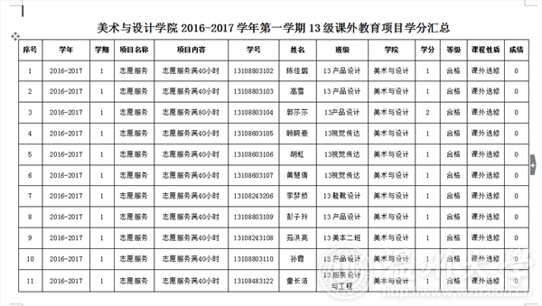 现将努努影院 2016-2017学年第一学期13级志愿者学分申请名单公示如下,还需要补申请的同学请加入qq群:328240294,进群下载“学分申请表”填写电子版,于本周日下午5点 前发至 [email protected]邮箱。时间满40/80小时可申请1个/2个学分。如有问题请联系何同学:15258031198。