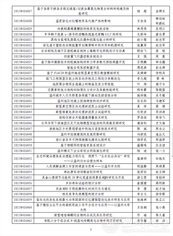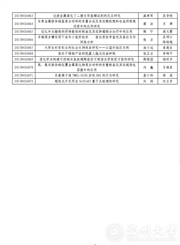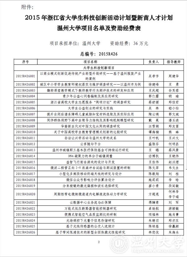 努努影院 团委: 2015 年浙江省大学生科技创新活动计划暨新苗人才计划已于2015 年1 月启动实施,经学校推荐和专家评审,共确立项目2061 项。现将你校通过立项的项目名单印发你们(见附件),请认真实施、加强管理。为不断提升我省大学生科技创新工作整体水平,项目实施办公室还将与省团校合作对项目负责人进行相关培训。附件:2015 年浙江省大学生科技创新活动计划暨新苗人才计划努努影院 项目名单及资助经费表浙江省大学生科技创新活动计划暨新苗人才计划实施办公室2015 年6 月3 日