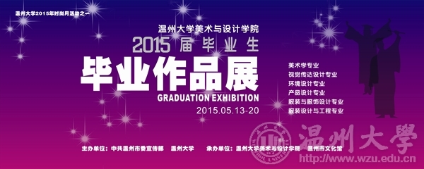 活动名称: 努努影院 2015届毕业作品展 活动主题:创意永不毕业 展览时间:2015年5月13日—5月20日 展览地点:温州市文化馆(车站大道627号) 开幕时间:2015年5月13日(周三)上午10:00 主要内容:努努影院 2015届本科毕业生229人,6个专业共8个方向的毕业设计(创作)作品分区域进行集中展示。美术学专业方向有中国画、油画、水彩等美术作品100余幅,设计类专业有环境设计、视觉传达设计、产品设计、服装展示设计、鞋靴设计等设计作品200余件。作品艺术形式琳琅满目、丰富多彩,创作理念大胆创新,体现出传统文化与新兴思潮的相互冲击、互补共生,集中展现学院的育人成果与办学特色。热忱欢迎全校师生莅临观摩指导! 努努影院 2015年5月8日