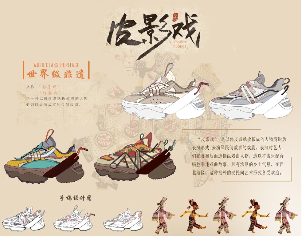 作品解析:灵感来源于世界级非遗文化-皮影戏。采用半透的滴塑材质并用重叠的方式连接鞋面部件,来表达皮影人偶的透光性和其关节的特殊结构,配色的灵感来源于传统皮影戏的植物颜料低明度的上色方式,体现复古的风格。