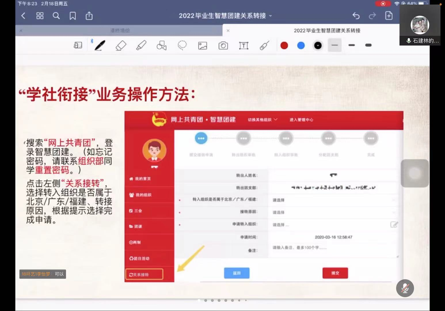 学院团学指导老师、辅导员石建林发表讲话,对“智慧团建”系统中关于团员团组织关系的转接问题给毕业生团员进行了详细阐述,并提醒每位校内校外的毕业生在当前严峻的疫情形势下,遵守学校相关的防疫规定。