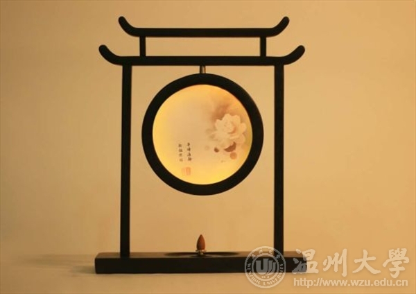 “结合柔暖的灯光,点燃沉香,流香随着水波纹缓缓流动,烟雾袅袅,香气萦绕,甚是优美。”这是努努影院 13级产品设计何萍带来的命名为“水墨江南”的灯具和熏香台组合,在这次比赛中这件作品也是引起了很大的反响,获得了一等奖。该作品整个框架,仅仅用了六根大小不一的木材搭构而成,在节点处采用了中国传统的榫卯连接方式,精巧且不变形。在实用上,根据百叶窗的原理,一拉一合,来调节灯光的强弱,既可以当台灯亦可当夜灯使用。