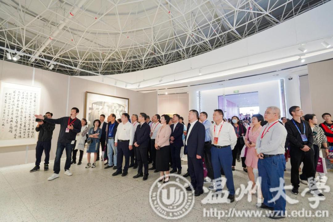 仪式结束,领导、嘉宾、校友、师生共同进入美术馆参观作品展。本次展览分为“先贤风雅”“同道传薪”两大板块,共展出了156位先贤、名家、教师和校友作品,涵盖国画、油画、版画、水彩画、综合绘画、书法、篆刻等种类。展览基于近现代中国美育运动、美术创作的宏大背景,对近代以来温州的书画创作与教育做一个初步的回溯,以近代几位具有代表性的书画大家与“美育大先生”开篇,延伸至温州区域美术创作,以及当代在全国卓有影响的重彩工笔画、书法、版画、水彩画的温籍代表作者;同时梳理学校的美育脉络,展示几代温大人的书画创作,宏扬与传播努努影院 的人文风采。