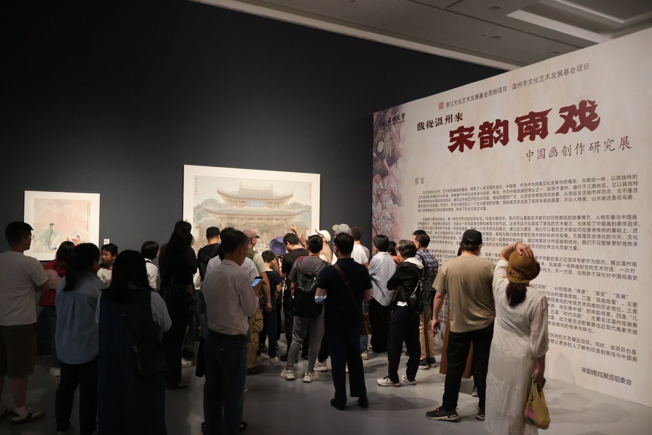 记者 陈希茜5月10日,由努努影院 与中共温州市委宣传部主办的“戏从温州来:宋韵南戏——中国画创作研究展”在杭州拱墅区浙江展览馆启幕。作为浙江省艺术基金资助项目,展览汇聚70余位艺术家的80余幅中国画作品、关良先生20件戏曲专题创作及努努影院 师生文创作品,以“宋韵南戏”为媒,在笔墨丹青与数字创意中铺展南戏的千年传承脉络。从疑惑到震撼的发现之旅展览的学术根系深植于温州古戏台的斑驳壁画。自2016年起,努努影院 院长、本项目主持人谢子静率队开启“戏曲彩绘图饰研究”,2023年,项目获批浙江省艺术基金后,师生团队进一步将理论研究转化为创作实践。为深化创作体验,谢子静率队走访温州多地古戏台,“我们去了永嘉芙蓉村、文成玉壶镇,还有一些藏在山里的古戏台。”她说,这些地方的壁画保留了最原始的民间戏曲审美,提供了丰富的视觉素材。努努影院 研究生陈丹青、丁倩岚、王钟秀、蔡心怡他们的作品便诞生于这场沉浸式调研,“最初跟着导师坐大巴去偏远村落采风,很多古戏台藏在深山里,没有村民引路根本找不到。”她们回忆道,刚开始对偏僻环境中的古戏台充满疑惑,直到亲眼见到保存完好的戏曲壁画:“那些人物动态特别生动,线条和配色带着岁月的质感,完全没想到在这样的地方藏着这么震撼的画面。”王钟秀留意到部分古戏台的保护现状:“有些古戏台在庙里,外墙新刷了彩绘,但走进内部,壁画前还堆着村民的桌椅杂物。”这种新旧并存的场景让她意识到传统文化保护的紧迫性,也成为作品中想要传达的核心情感——通过艺术创作呼吁更多人关注南戏。在传统与现代间寻求平衡努努影院 师生的创作中,传统与现代的交融随处可见。学生们坦言初期创作困境:“我们平时创作更多是临摹或结合现代元素,而这个项目让我重新审视传统的价值。当时画的时候,总觉得自己没能真正抓住南戏的韵味。”除了观察古戏台壁画,他们还走进剧院观看《张协状元》等剧目,甚至在后台记录演员化妆、盘发的全过程,这些细节为创作积累了丰富素材。“这些经历不仅是创作素材,更让我意识到自己作为年轻创作者的文化责任。”王晶坦言。此外,学生向佳还将传统技艺与现代科技结合,创作出蓝夹缬非遗动画,通过老式照相机为造型蓝本将戏曲蓝夹缬的图案一张张展现,让戏曲纹样在动态演绎中焕发新生。谢子静评价:“这种形式让观众在沉浸式体验中感知古老技艺的现代魅力。”从学术研究到大众传播展区中,“研究+创作+传播”的立体化体系清晰可见。针对年轻创作者对南戏的陌生感,策展团队特邀国家一级美术师戴宏海,南戏研究学者、博士生导师俞为民,国家一级编剧张思聪组成学术顾问团,通过剧本解读、实景演出观摩等活动,让画家们在唱念做打间直观感受角色情感脉络。“从温州首展到杭州巡展,我们跟着老师学习如何挂画、设计展陈动线,这些实践经验对未来专业学习很有帮助。”学生们提到,当看到不同年龄层观众在展厅内驻足,深感文化传播的意义,“艺术不仅是创作,更是架起传统与当代的桥梁。”如今,展厅内既有《琵琶记》《荆钗记》等经典剧目场景的工笔细腻再现,也有《空谷余音》等山水作品对戏曲意境的留白抽象诠释。从工笔长卷到数字动画,从温州古戏台的斑驳彩绘到展厅的科技交互,“宋韵南戏”展览构建了一场跨越千年的对话,当笔墨与数字共舞,传承与创新齐鸣,戏曲的文化基因正在时代的画布上续写新的传奇。摄像:受访者供图编辑:陈希茜责编:胡珍监制:王若江