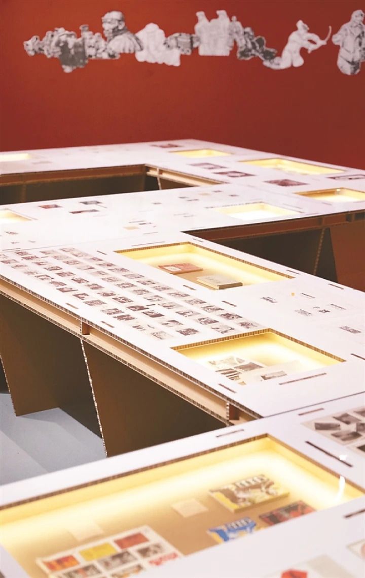 展览中大量使用了瓦楞纸展柜和桌椅,材料环保、视觉清新,可以短时间拉近与观众的距离,一如布展时一位工人所言,展览“没有‘科技’,全是‘狠活’”。“我们的设计用瓦楞纸等材料,在展览中呈现出‘陕北+东北’的气息。”展览空间设计师孙华说。据齐鑫介绍,展览希望呈现连环画与文学、电影、摄影等其他文艺门类的联系,“用连环画书籍的封底作展品图说,信息一目了然,减少人为设计的元素干扰,让展品的气息更加连贯”。在四川美术学院教授、中国美协连环画艺委会委员陈树中看来,展览中所呈现的大量连环画作品、创作小样、写生图、文字记录、照片、废稿、书籍、反转片等“需要处理的图像文字资料工作量非常大,也是对策展方的挑战”。