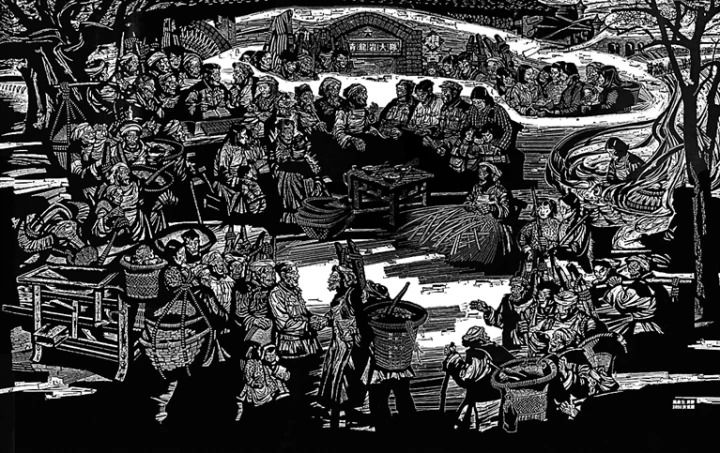 由于时代背景的特殊性,作品命题、构思的规定性,众多人物组织的复杂性,版画的语言塑造、翻版木刻、刀法创新、印刷等程序艰巨繁重,时时考验着版画家的脑力、精力、体力和对材料性能的掌控能力。创作过程中,素描木刻转换度、印刷合成精准度、持续工作劳动强度,是一道又一道必须迈过的坎。