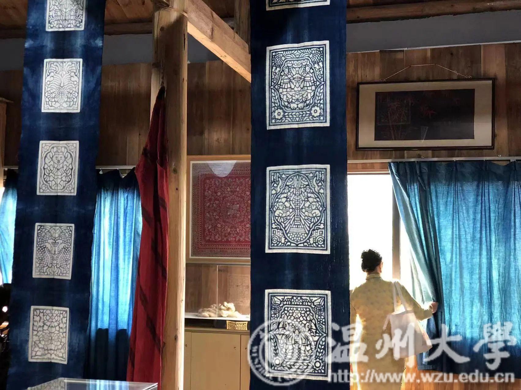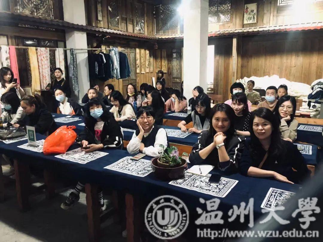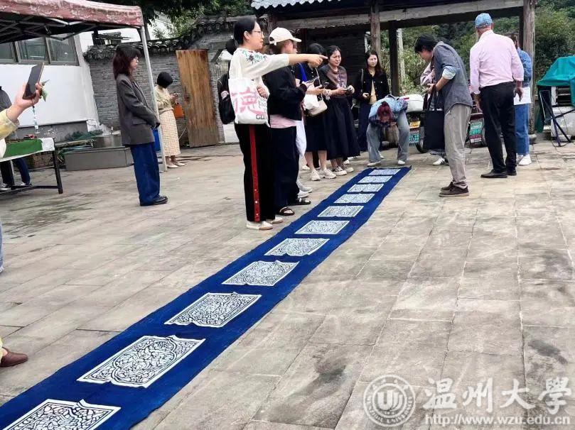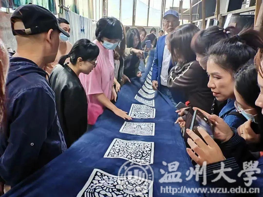 夹缬作为最古老的的一种印染艺术,温州蓝夹缬现已成为国家级的非物质文化遗产。学员们参观蓝夹缬采成博物馆,聆听国家级非遗传承人王河生老师的亲自授课。