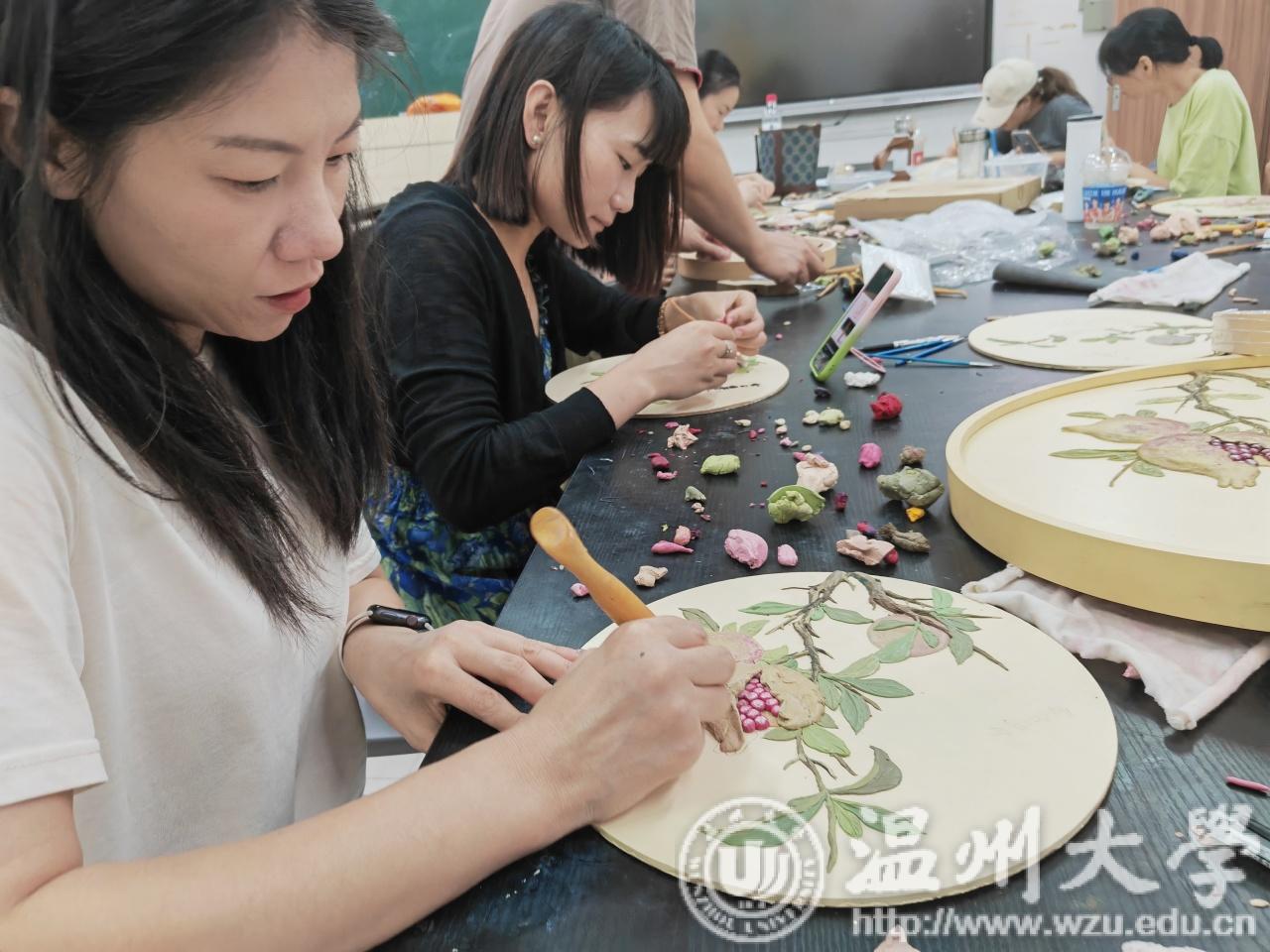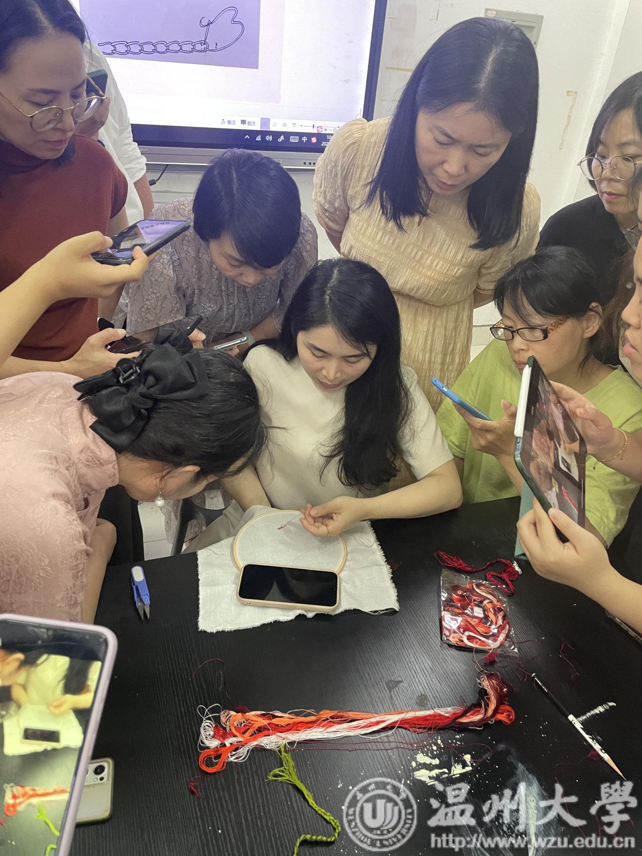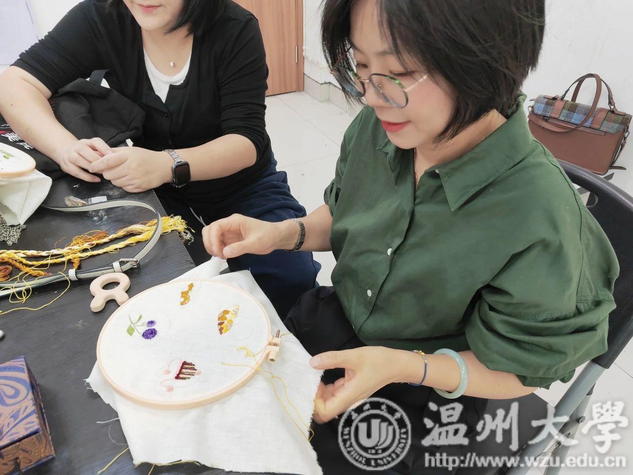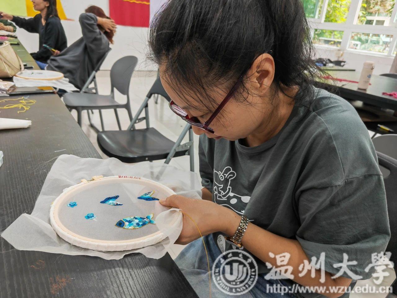 瓯绣是国家级非遗技艺,图案秀丽、色彩丰富、绣功精细、针法多变。温州市瓯绣非遗传承人余琼老师进阶性从起针,分线,绷布,描画,多种针法步骤进行讲授,并带领学员进行瓯绣小品创作。金晨怡教授在刺绣造物课程中传授刺绣技法、饰品与文创设计、非遗微课开发等内容。“通过这次学习借着刺绣,来一场与传承手艺的对话。我更熟练地掌握了瓯绣绣法。相信今后,一定能够绣出更好的作品。”有学员曾说过。
