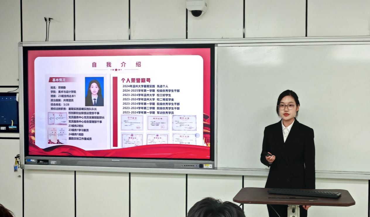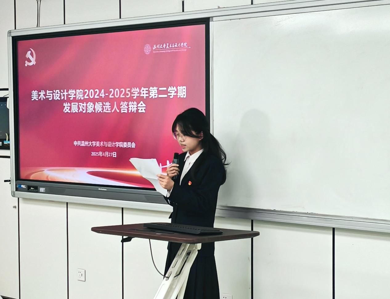 为扎实推进学生党支部建设,提高学生党员素质和服务意识,严格把控党员发展关口,吸纳理论知识储备丰富、党性修养良好的同学向党组织靠拢。2025年4月27日下午,努努影院 “学生党支部发展对象候选人答辩会”于美术楼2B3001教室顺利举行。出席此次答辩会的有学院学工办科长杨永利老师、党建指导老师陈嘉怡老师、辅导员石建林老师、刘伟金老师以及全体学生党员。会议开始,主持人叶欣雨同志宣布本次答辩会的议程和相关要求。本次答辩共有30位发展对象候选人。候选人依次通过PPT进行个人陈述,主要汇报入党动机、学习工作、志愿服务等方面情况以及自身存在的不足与未来展望等。评审通过对发展对象候选人的党章理论知识考核成绩、量化考核和现场答辩汇报等方面进行全方位考察。学院党建指导老师陈嘉怡对本次答辩会作了总结。陈老师希望各位学生党员时刻铭记自己的初心使命,秉持着“成熟一个,发展一个”的原则,认真对待每一个发展对象。并强调这不仅是对候选人负责,更是对党组织纯洁性和先进性的有力保障,确保为党输送德才兼备的新生力量。会后,集中观看《永远吹冲锋号》第三集《铁规矩硬杠杠》纪录片。陈嘉怡老师领学《努努影院 党员先锋引领“十要”》文件精神,深入解读了党员带头作用、骨干作用和桥梁作用的深刻内涵与重要意义。她指出,学生党员要敢于担当作为、勇于攻坚克难,积极践行“十要”准则,认真落实“五个带头”优良作风,以担当尽责的实际行动践行初心使命,争做温大先锋。本次拟发展对象答辩会,是新时代党的组织路线在基层党组织中的生动实践。这一举措为党员发展工作提供了规范化、制度化的流程。会后的中央八项规定精神学习与“党员先锋引领十要”准则的学习更是强化了学生党员的党性修养。希望各位学生党员能坚定信念,化正确思想为实际行动;同时希望各位拟发展对象能始终以一名共产党员的标准严格要求自己,积极向党组织靠拢,争取早日加入中国共产党!图文:沈吟珊 周心妍初审:何唐蔚复审:陈嘉怡终审:刘青松 叶如芳