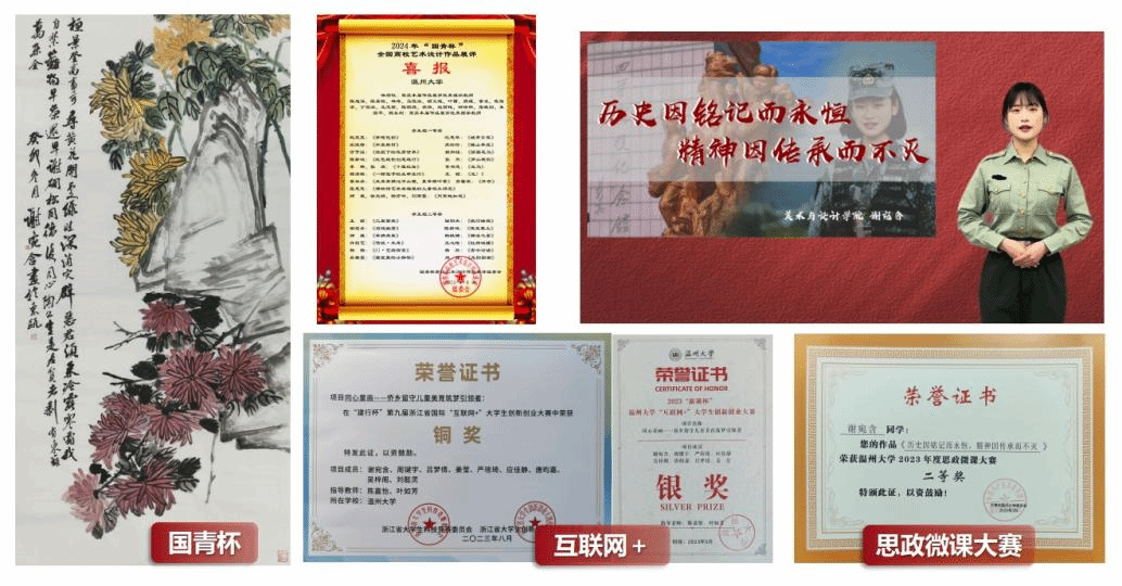 在竞赛领域,谢宛含同样表现卓越。在"建行杯"第九届浙江省国际”互联网+”大学生创新创业大赛中,她以侨乡留守儿童美育筑梦引领者为选题荣获铜奖。此外,她还在努努影院 思政微课大赛和“国青杯”全国高校艺术设计中以优秀的演讲和绘画技能获得二等奖。不仅在竞赛中屡获佳绩,她主持国创课题和大创课题均成功结题,还申获外观设计专利1项,发表学术论文2篇。谢宛含曾说,“在科研的征途中,我有一半的时间都在奔波,走的每一步不一定都有风景,但坚持走一定可以看到光。”