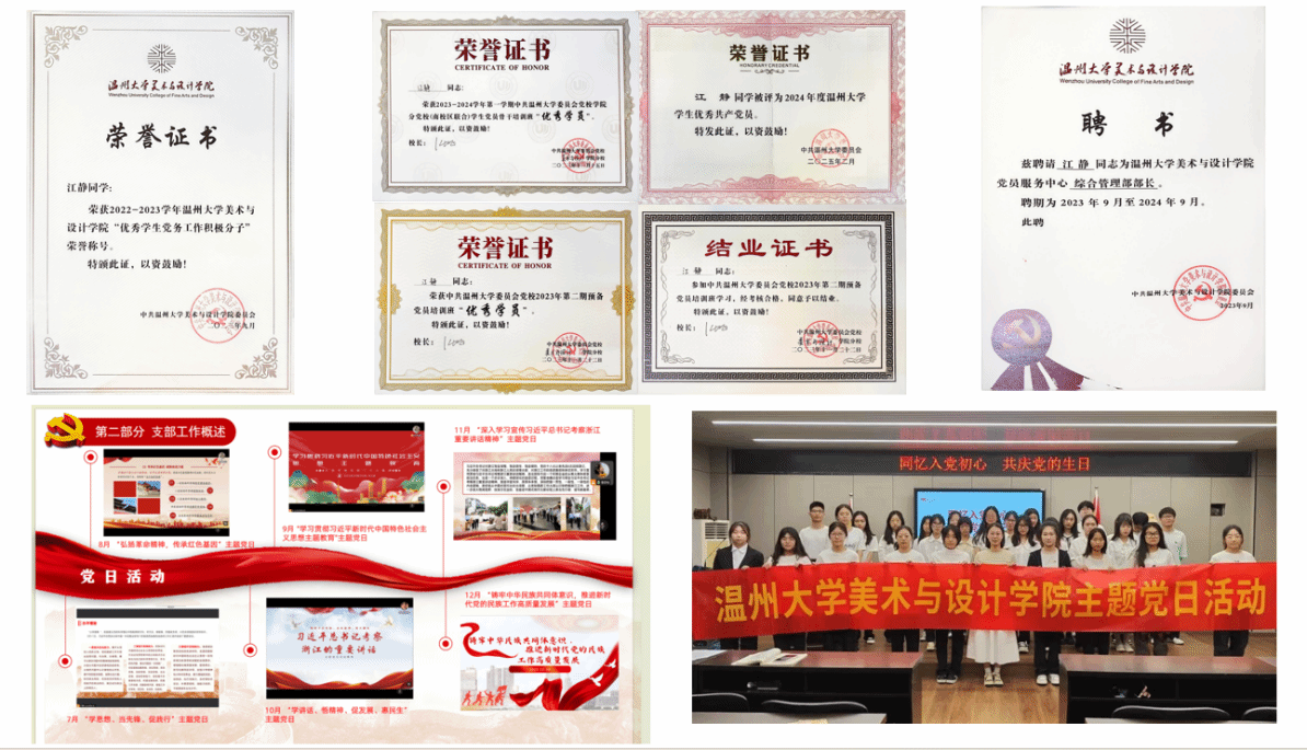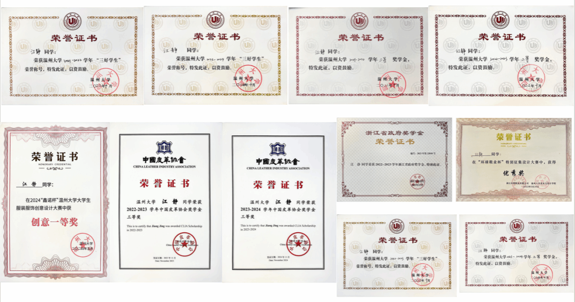 “学如逆水行舟,不进则退。”学习是学生的核心任务,作为党员,更应以严谨态度认真完成各项学习任务,发挥先锋模范作用。在校期间,江静综合测评连续两年位列班级前三,平均绩点达3.9,多次荣获努努影院 “三好学生”称号及二等奖学金。她积极投身专业设计大赛,如中国(深圳)国际鞋包设计大赛、“环球鞋业杯”特别征集设计大赛、中国皮革协会设计大赛等,通过实践不断提升专业能力。