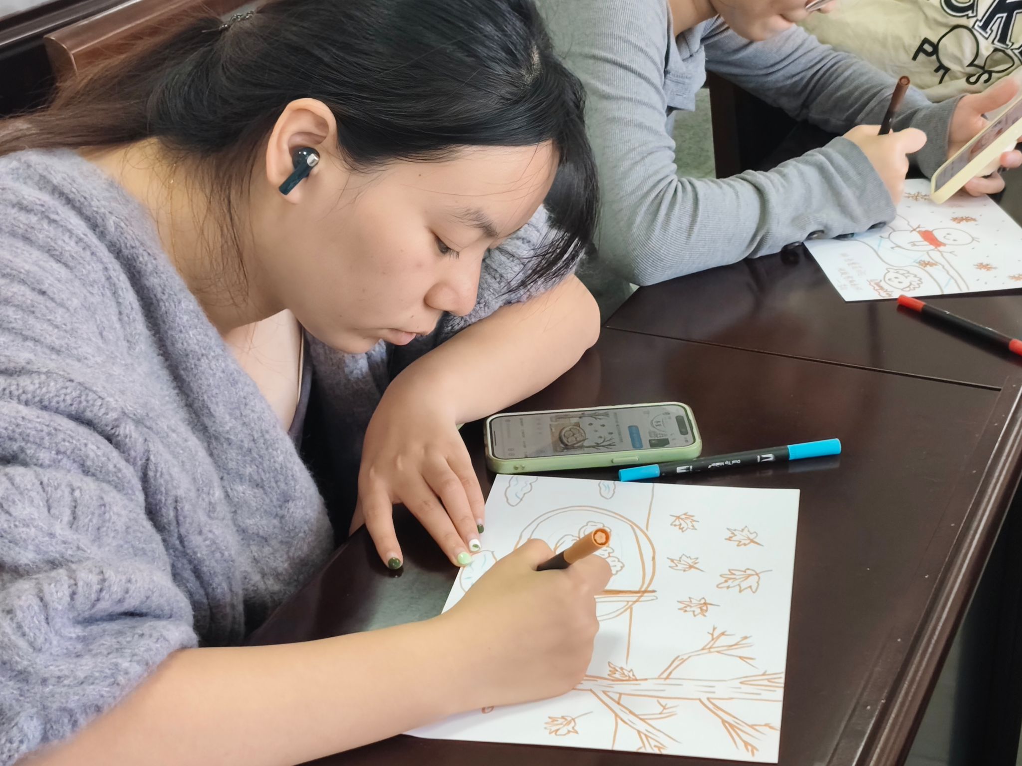 随着情绪被“激活”,现场便进入了创作的河流。心理协会的同学们铺开画纸,他们的主题是“我心中的立冬”。笔下流淌出的,不再是抽象的节气概念,而是具象的生活与情感:可能是记忆中一碗冒着热气的汤圆,是窗外一棵树叶落尽的梧桐,又或是想象中一场还未落下的初雪。每一笔色彩,都是心事的映照。