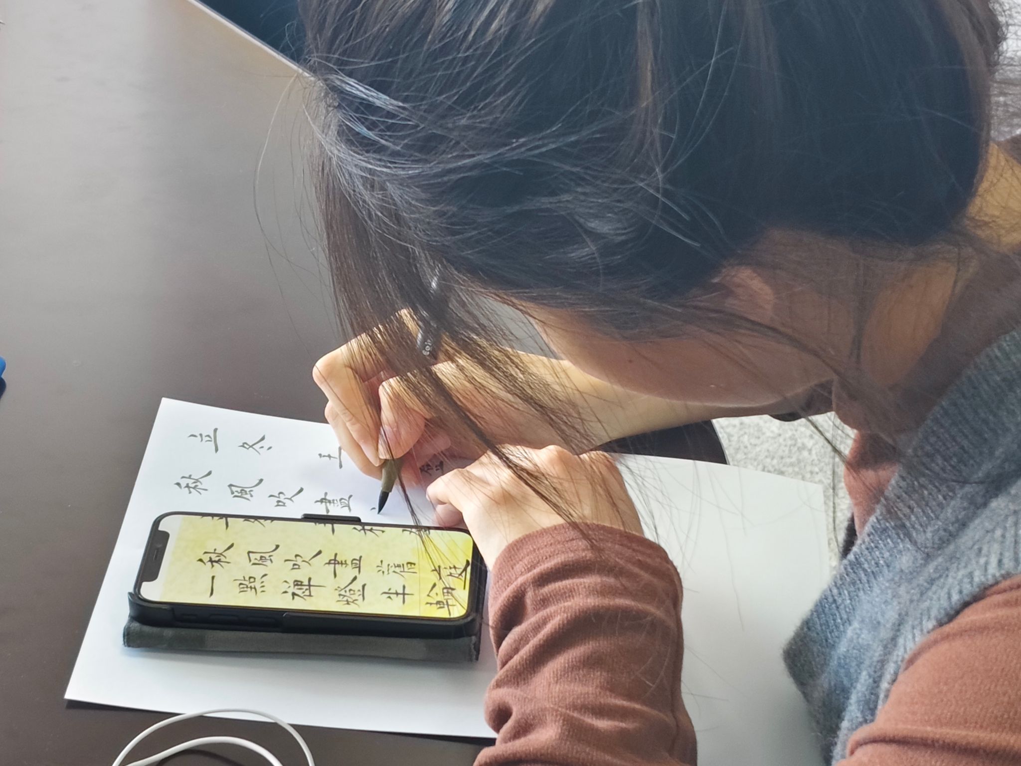 当个人的画作与集体的书法在展板上汇聚,活动进入了最温暖的分享环节。同学们围站在一起,讲述作品背后的心情故事。有人因一幅画而结识了有相似感受的新朋友,有人因一句诗而产生了深深的共鸣。笑声与掌声此起彼伏,艺术的表达在此刻成为了连接彼此的桥梁,驱散了冬日的微寒。