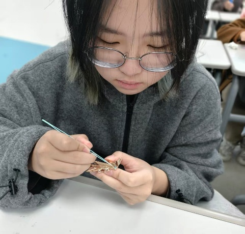 指尖翻飞间,原本零散的贝壳片,经同学们的巧思与巧手,渐渐变成了一件件精致灵动的螺钿作品。打磨、粘贴、调整,每一个步骤都饱含心意;勾勒、搭配、点缀,每一处细节都彰显匠心。创作完成后,同学们在心意卡片上写下真挚的祝福,将螺钿作品精心包装,亲手赠予身边的同学,一句句暖心的话语、一件件精美的作品,传递着同窗间的真诚与善意,现场氛围温馨而热烈。