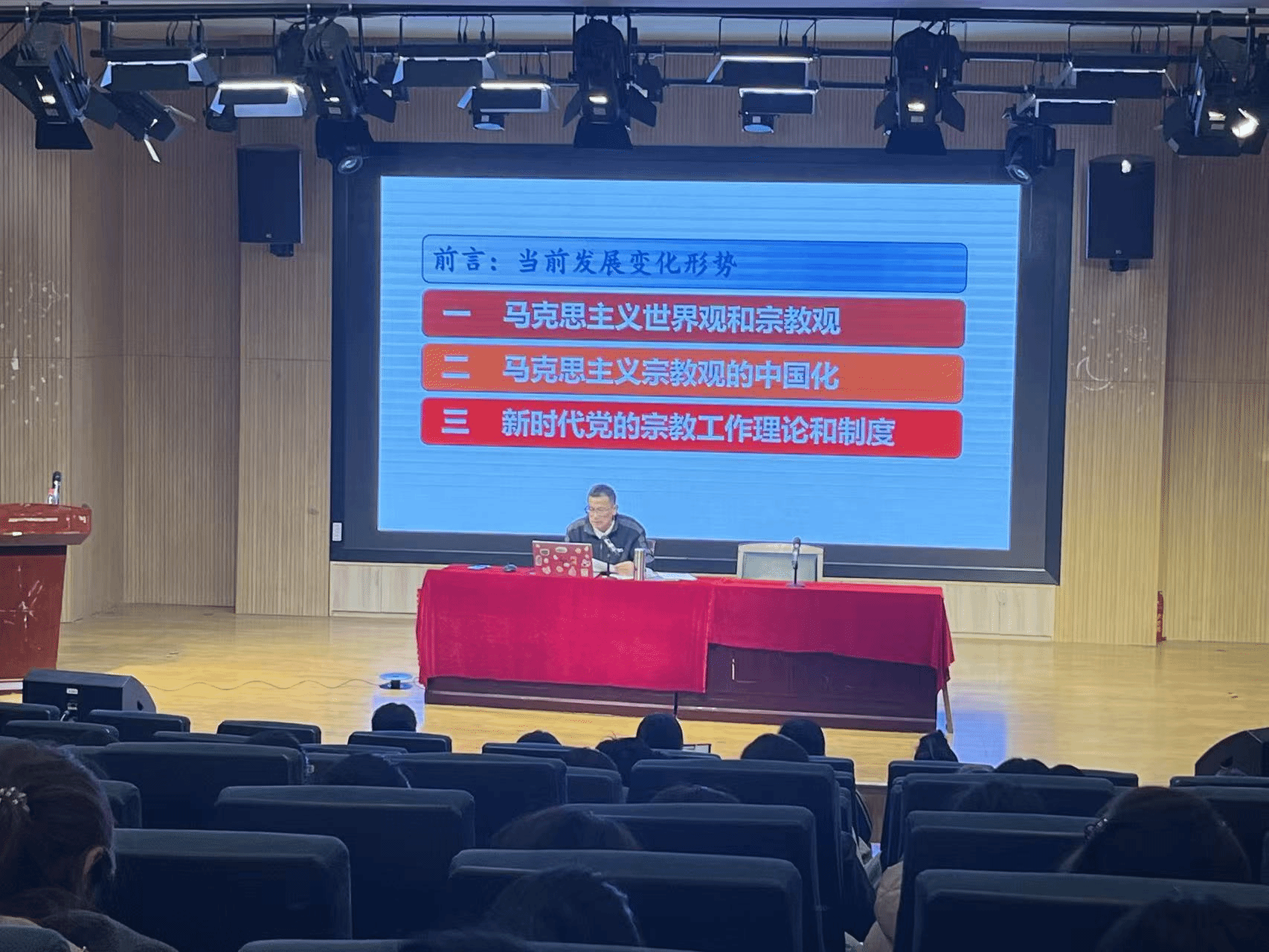 报告会上,王柏民老师围绕马克思主义宗教观的核心要义展开系统解读:从宗教的本质属性出发,结合马克思主义经典理论与当代社会实际,阐明宗教产生、发展的客观规律;详细解读党的宗教政策,强调“尊重宗教信仰自由,坚决抵制非法宗教活动”的核心原则;结合新时代中国国家安全观,指出非法宗教活动对校园环境、社会稳定的潜在风险。